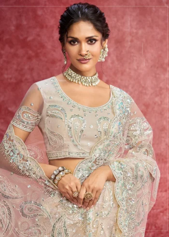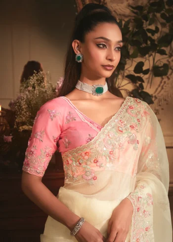Cream Tissue Organza Silk Embroidered Wedding Saree