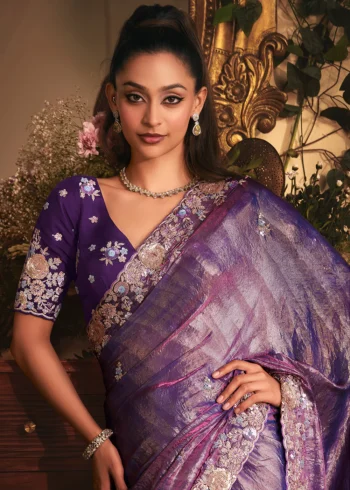 Violet Tissue Organza Silk Embroidered Wedding Saree