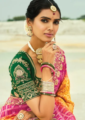 Traditional Mustard Rani Pure Georgette Embroidered Bandhej Designer Saree