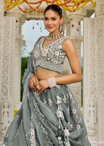 Grey Organza Fabric Beads and Sequin Embroidered Ready to Wear Lehenga Choli With Dupatta