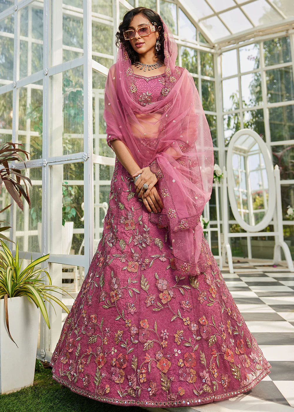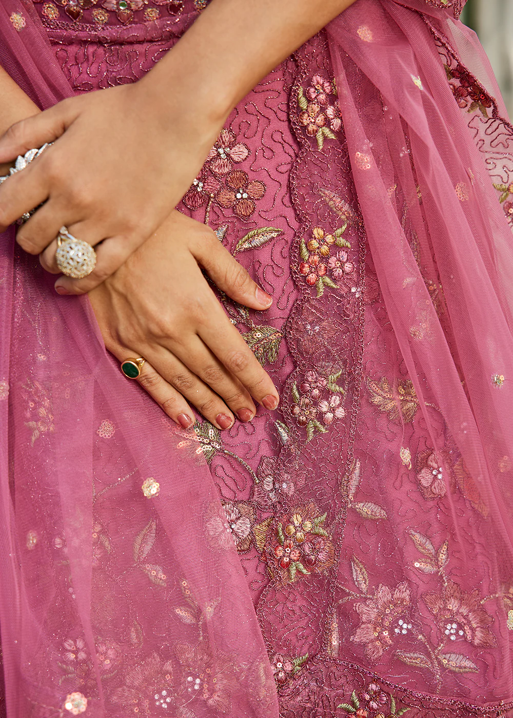 Pink Floral Embroidered using Thread, Coding, Sequins, Zarkan, Mirror Work Net Semi-Stitched Lehenga Choli Set – INK6150PK