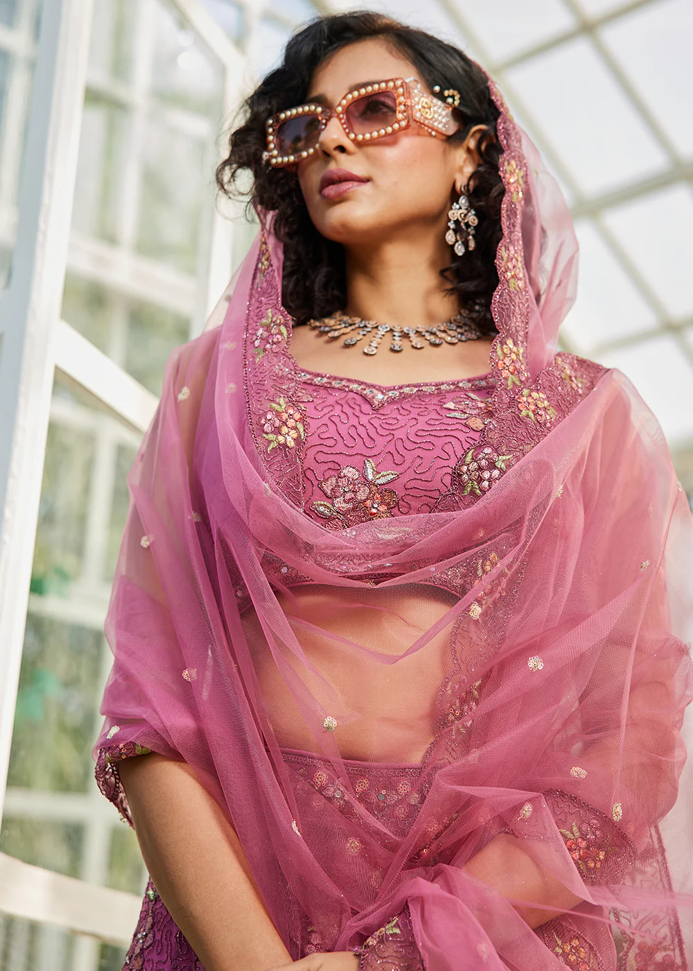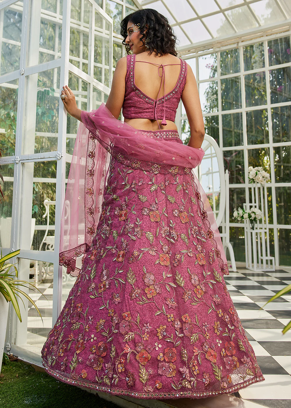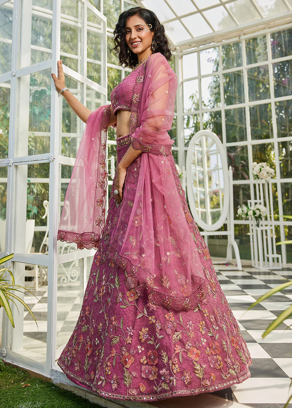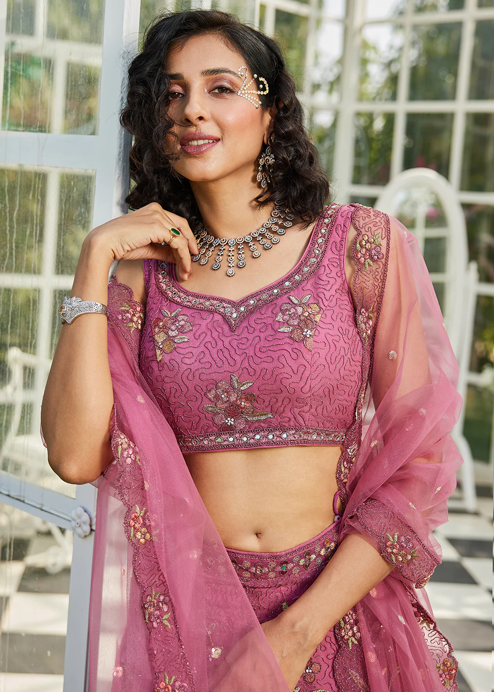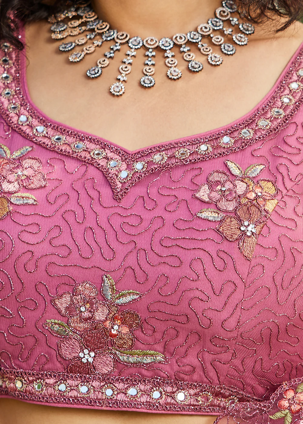 Pink Floral Embroidered using Thread, Coding, Sequins, Zarkan, Mirror Work Net Semi-Stitched Lehenga Choli Set