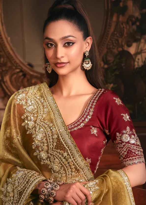 Dusty Gold Tissue Organza Silk Embroidered Wedding Saree – KS5484