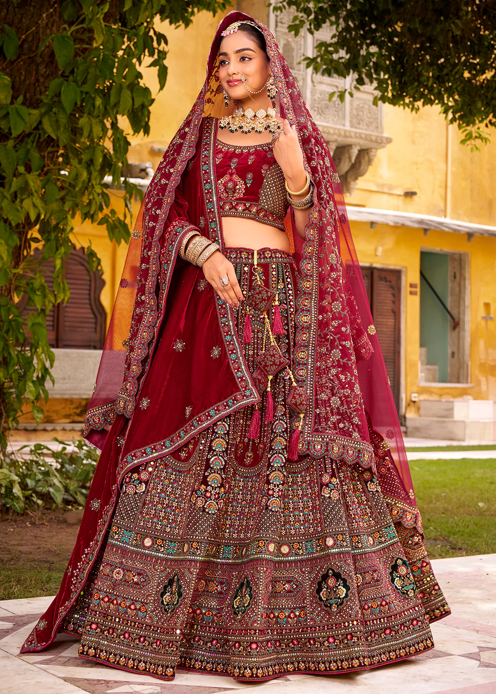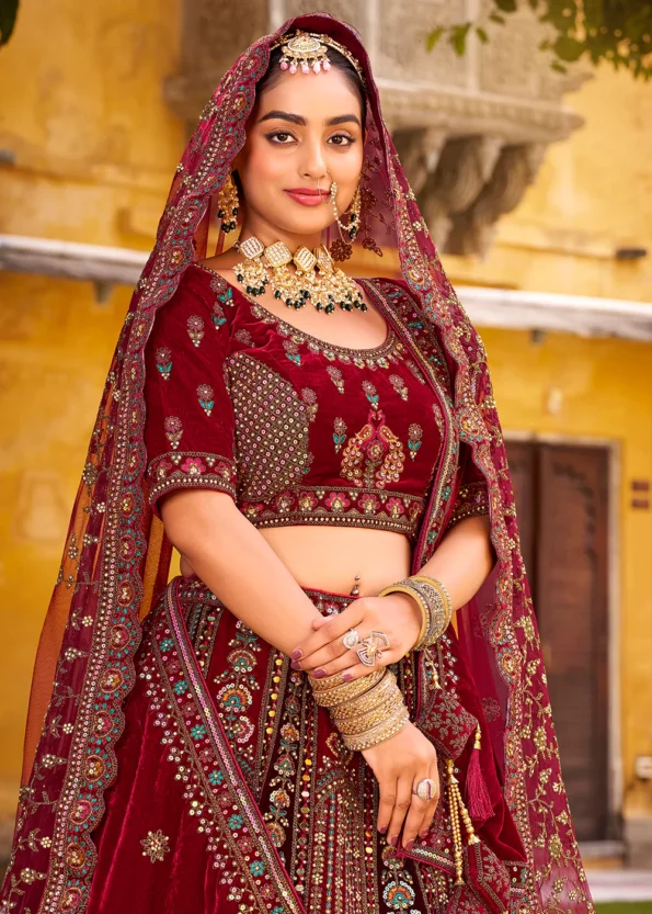 Elegant Traditional Maroon Bridal Lehenga Choli with Intricate Embroidery.