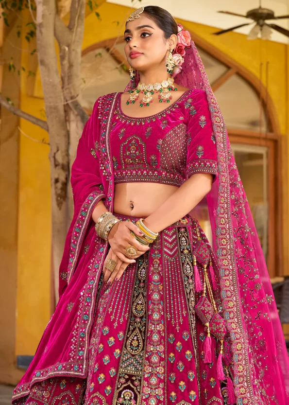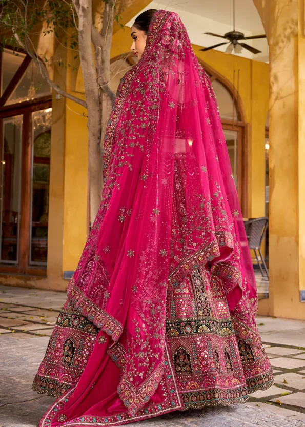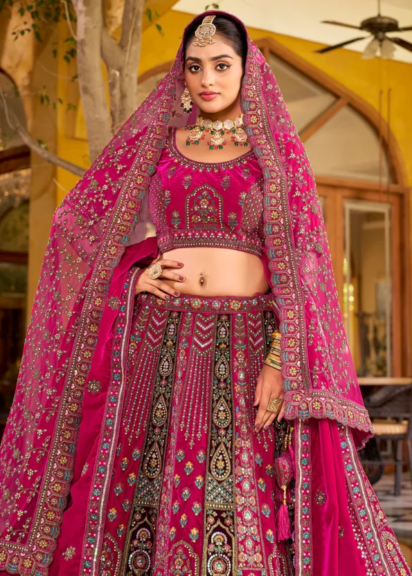 Elegant Traditional Rani Pink Bridal Lehenga Choli with Intricate Embroidery.