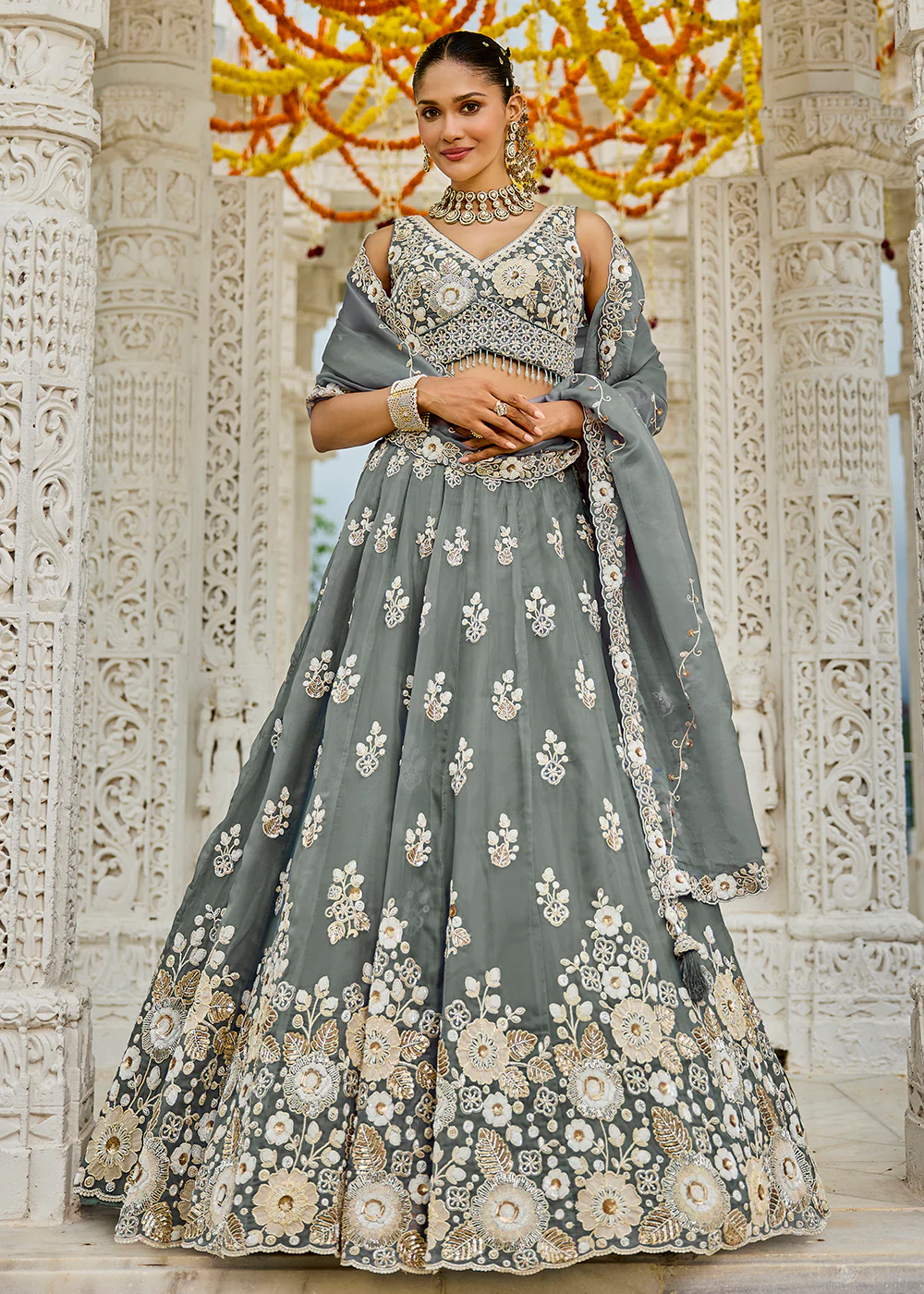 Grey Organza Fabric Beads and Sequin Embroidered Ready to Wear Lehenga Choli With Dupatta
