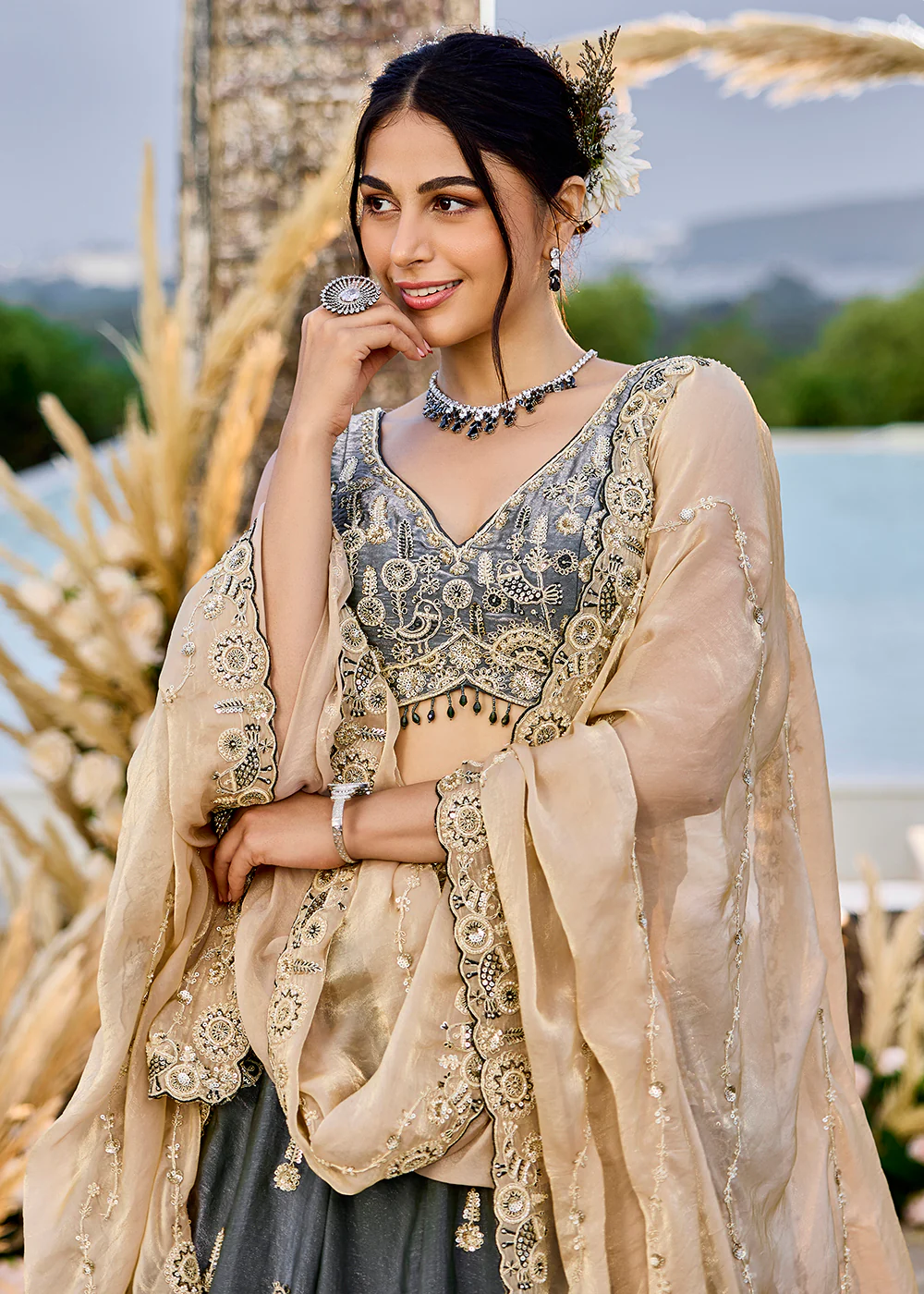 Grey Tissue Fabric Beads and Threads Embroidered Ready to Wear Lehenga Choli With Dupatta