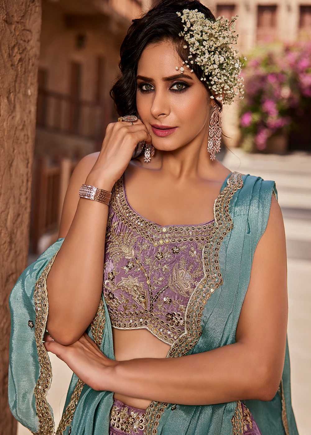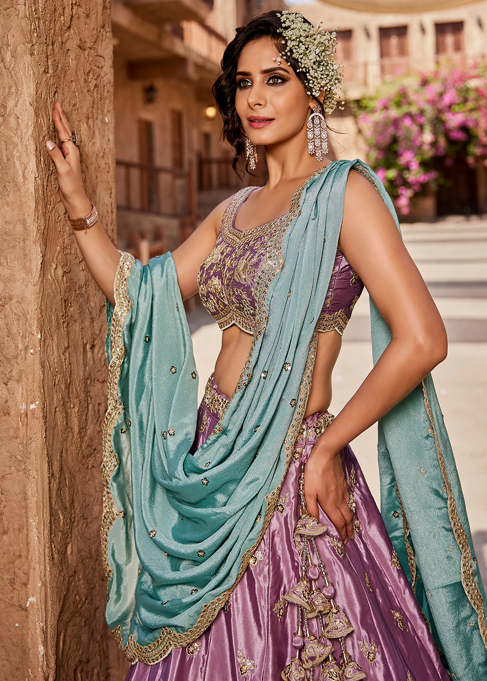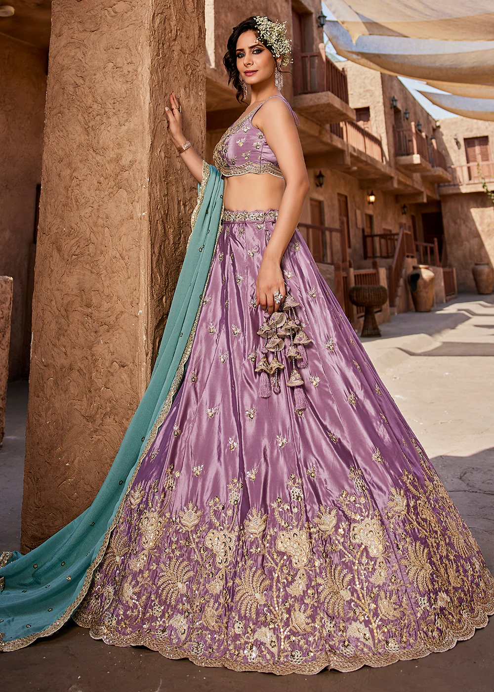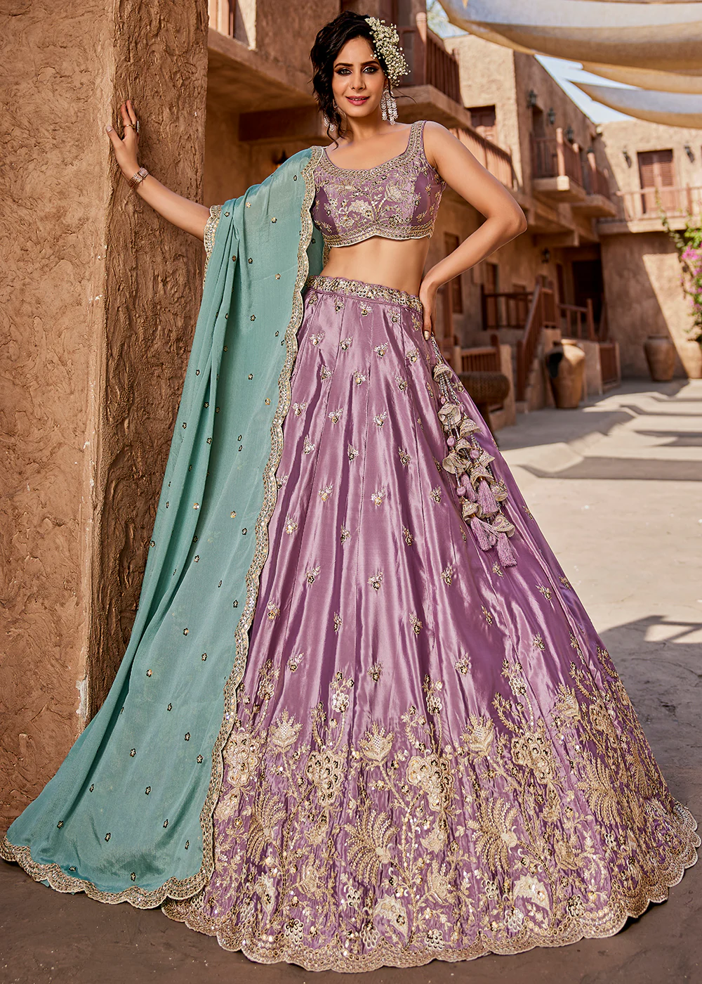Lavender Satin Silk Sequinse embroidered Wedding Semi-Stitched Lehenga choli.