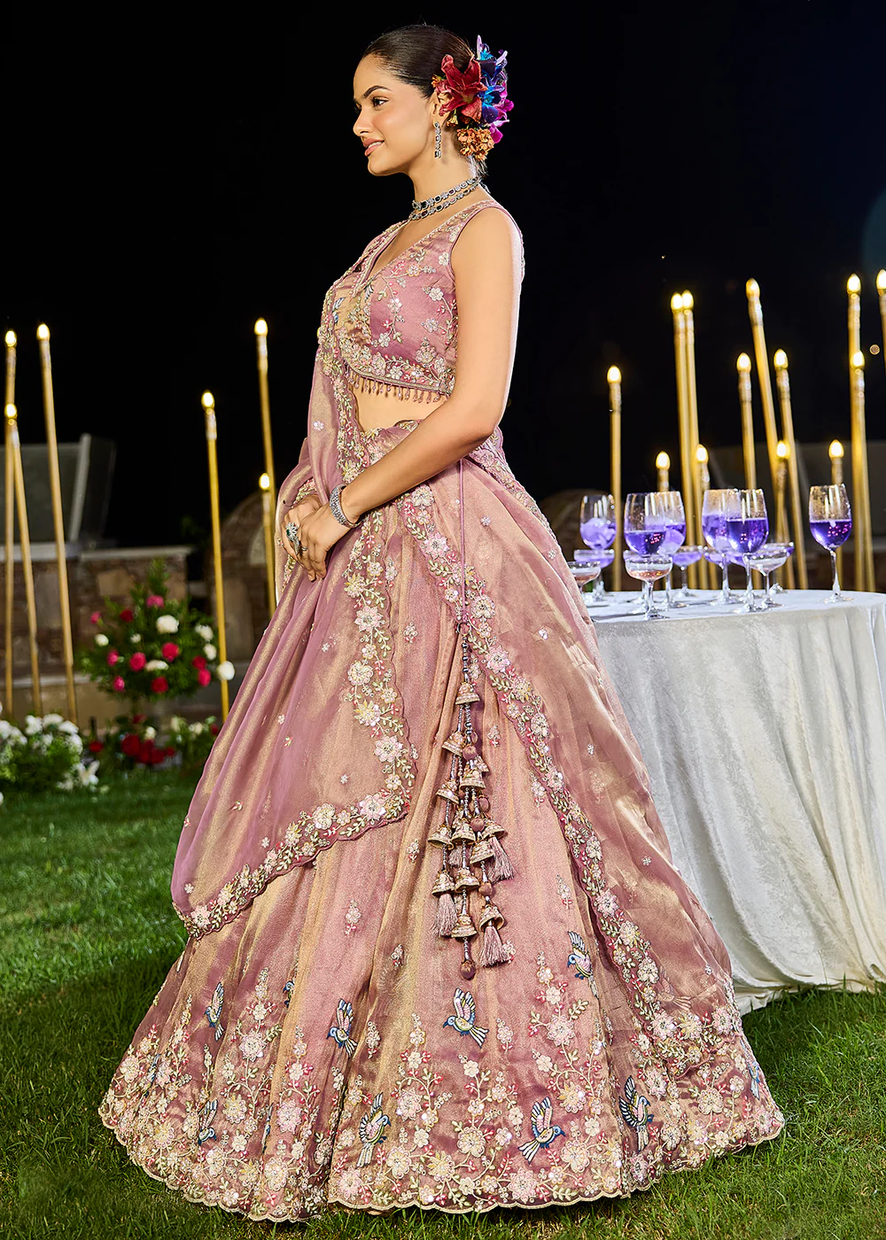 Lavender Tissue Fabric Beads and Threads Embroidered Ready to Wear Lehenga Choli With Dupatta