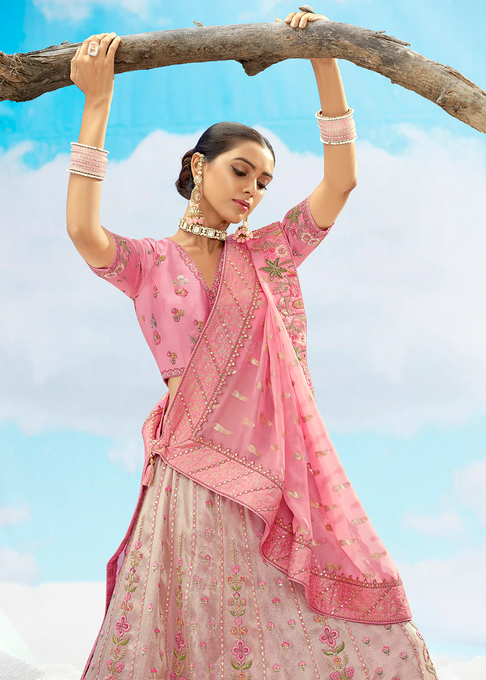 Exude regal elegance in this Pink Fancy Silk Bridal Lehenga Choli, adorned with intricate heavy embroidery, shimmering stone and sequin work, delicate weaving butti patterns, and a stunning cut work border – a perfect blend of tradition and grandeur.