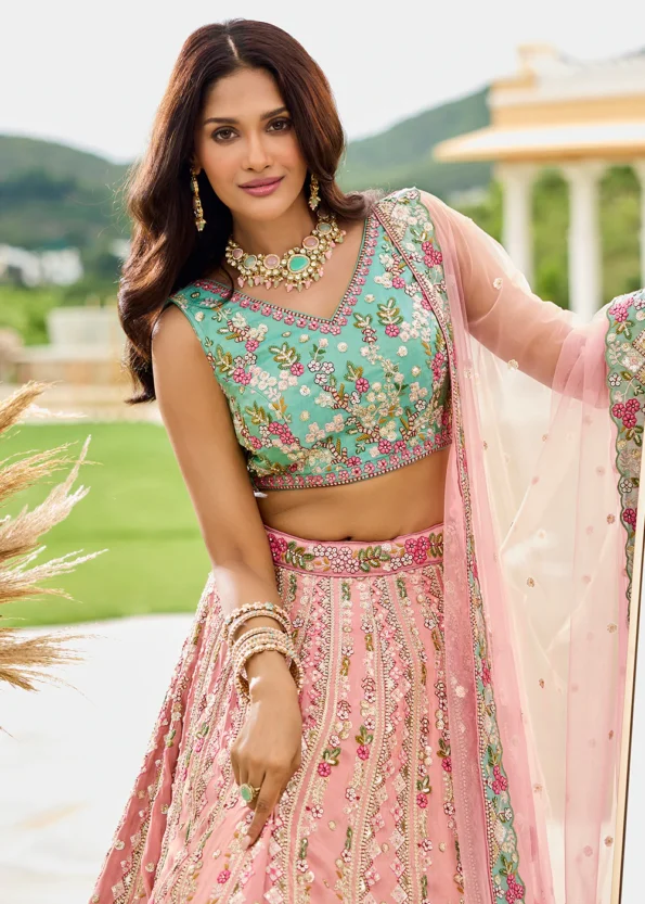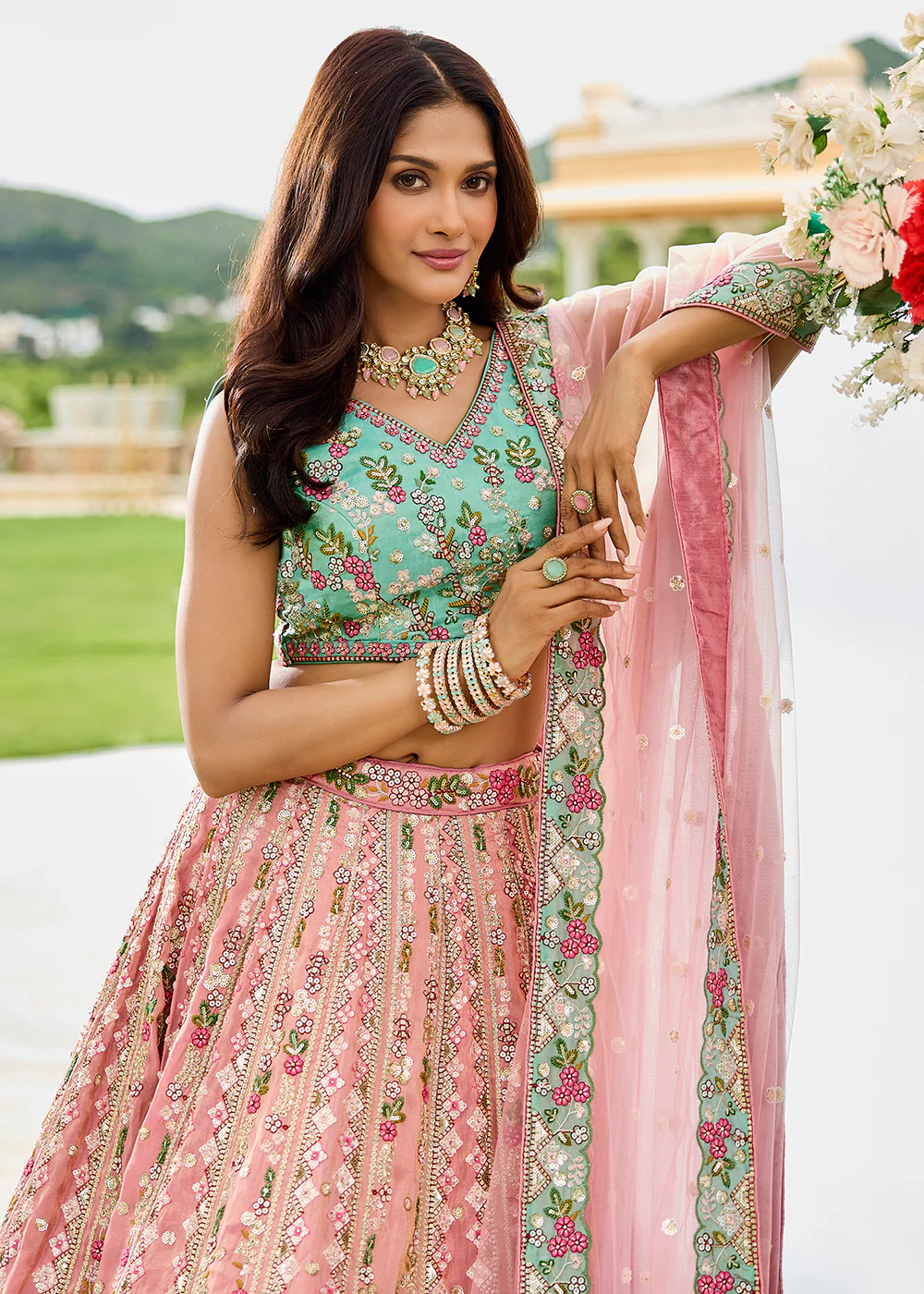 Pink Tissue Fabric Premium Wedding Semi-stitched Lehenga Choli