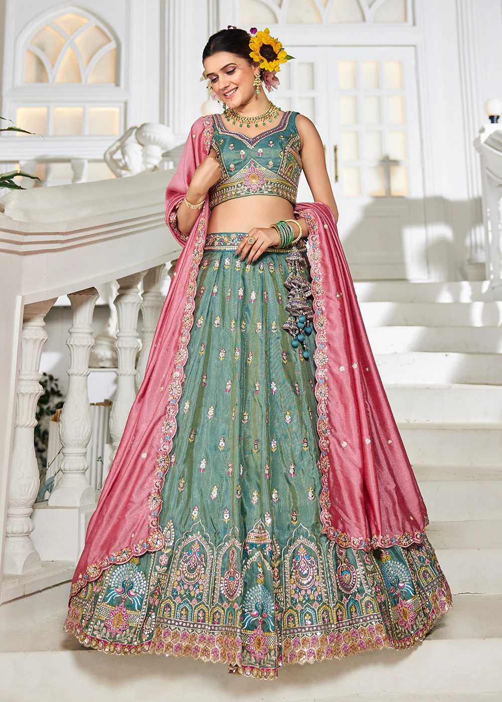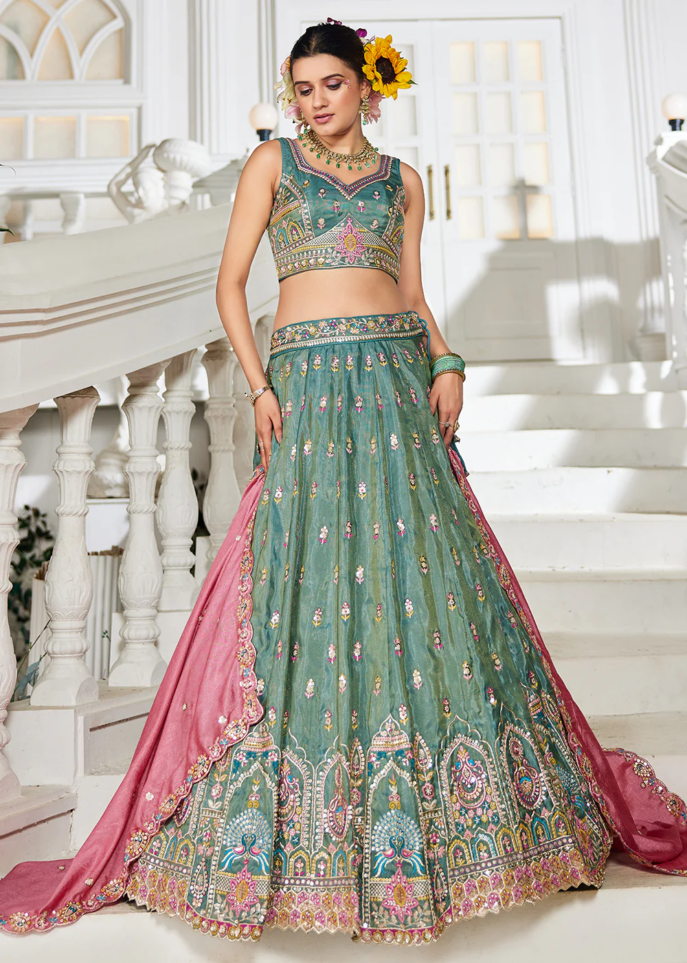 Sea Green Tissue Fabric Sequinse Embroidered Semi Stitched Lehenga Choli – INK6203SG