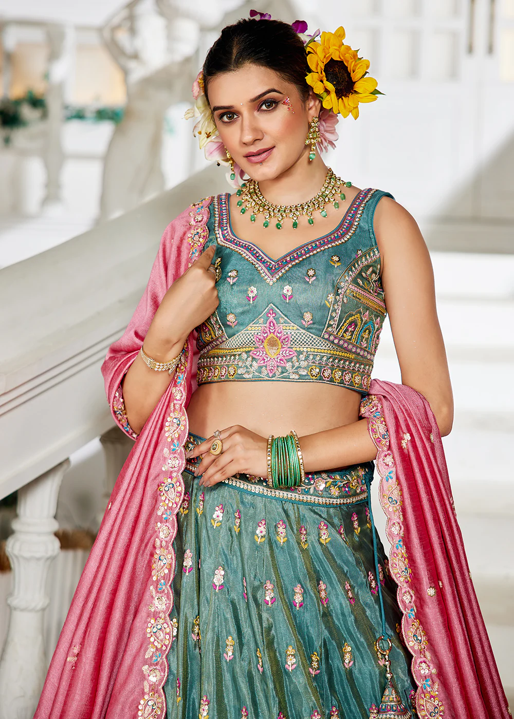 Lehenga Flair: 3.4 meters of flair, ensuring a dramatic flow and movement.