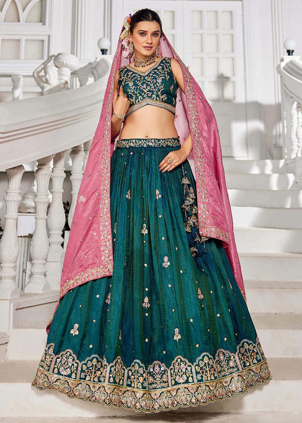 Teal Satin Sequinse embroidered Wedding Semi-Stitched Lehenga choli.