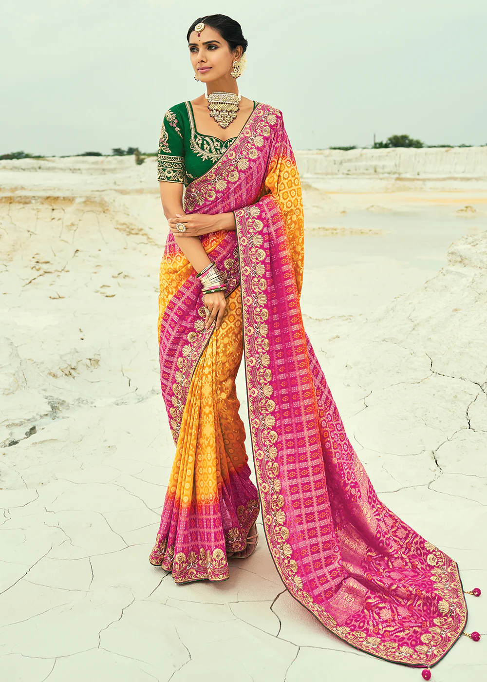 Traditional Mustard Rani Pure Georgette Embroidered Bandhej Designer Saree