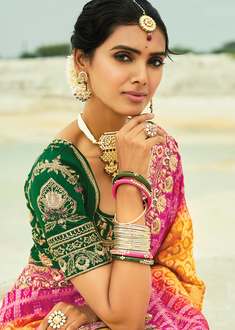 Step into a world of regal elegance with The Royal Collection, an exclusive range of luxury Indian Bandhej sarees that honor the grandeur of age-old traditions. Meticulously crafted using rich handwoven fabrics, authentic zari embroidery, and vibrant jewel-toned colors, each saree is a masterpiece of timeless Indian artistry.