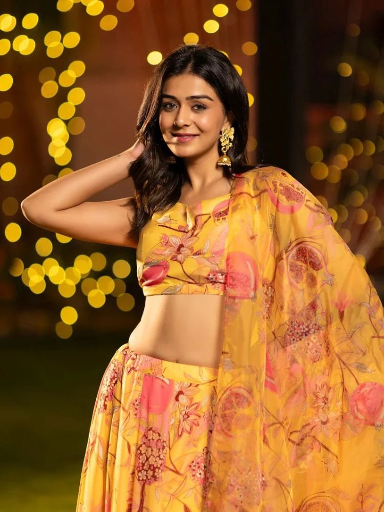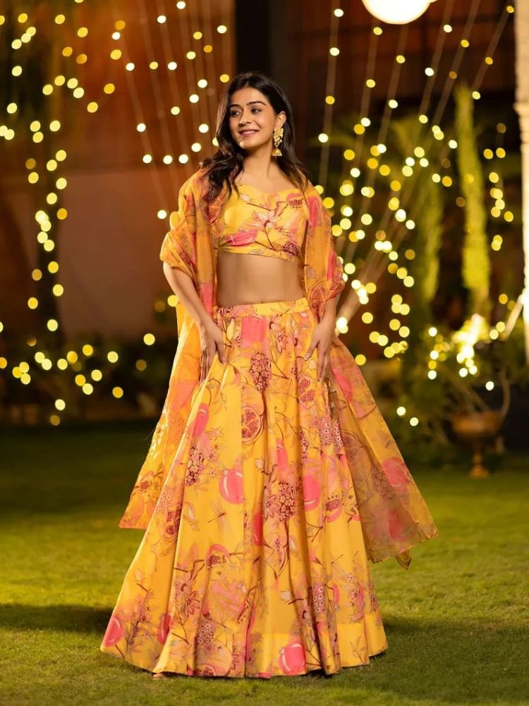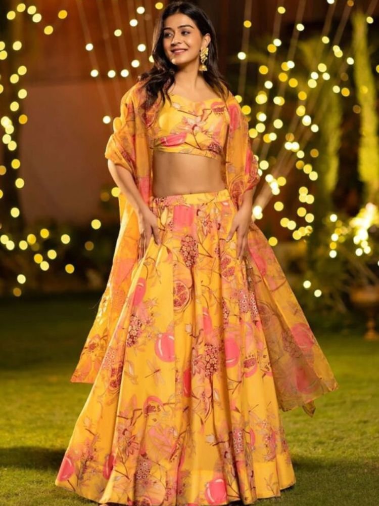 Mustard Printed Heavy Airtex Chinon Lehenga Set
