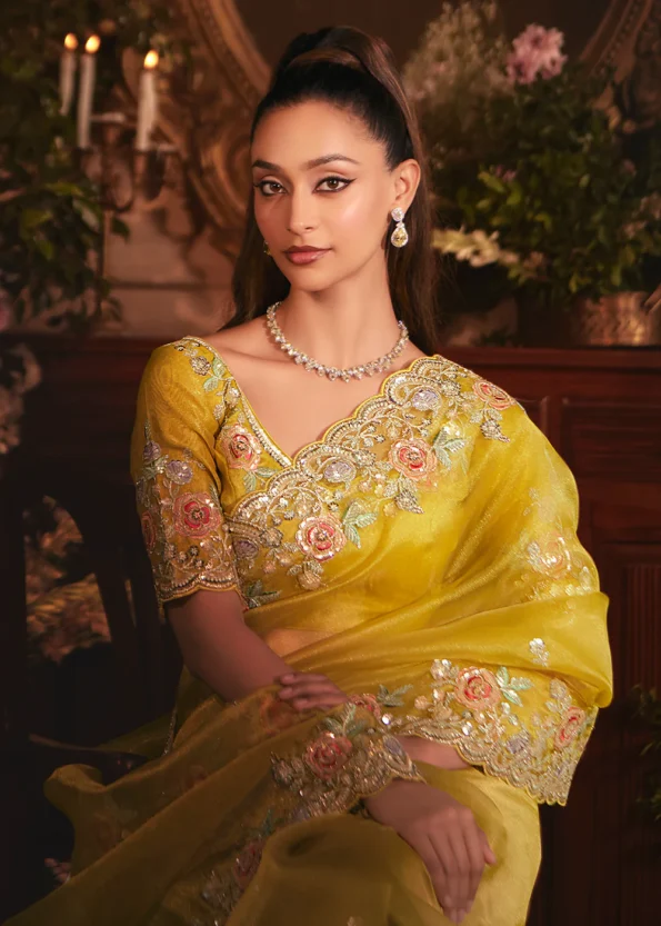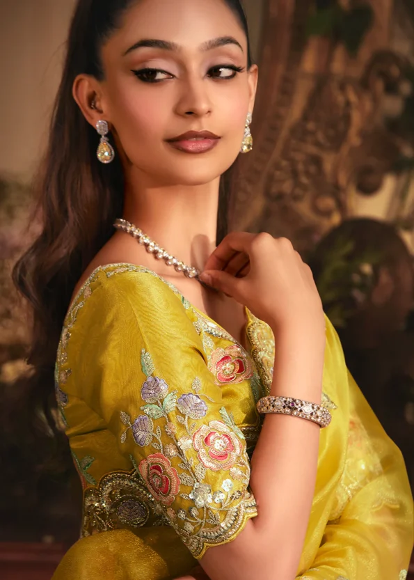 Yellow Tissue Organza Silk Embroidered Wedding Saree – KS5487